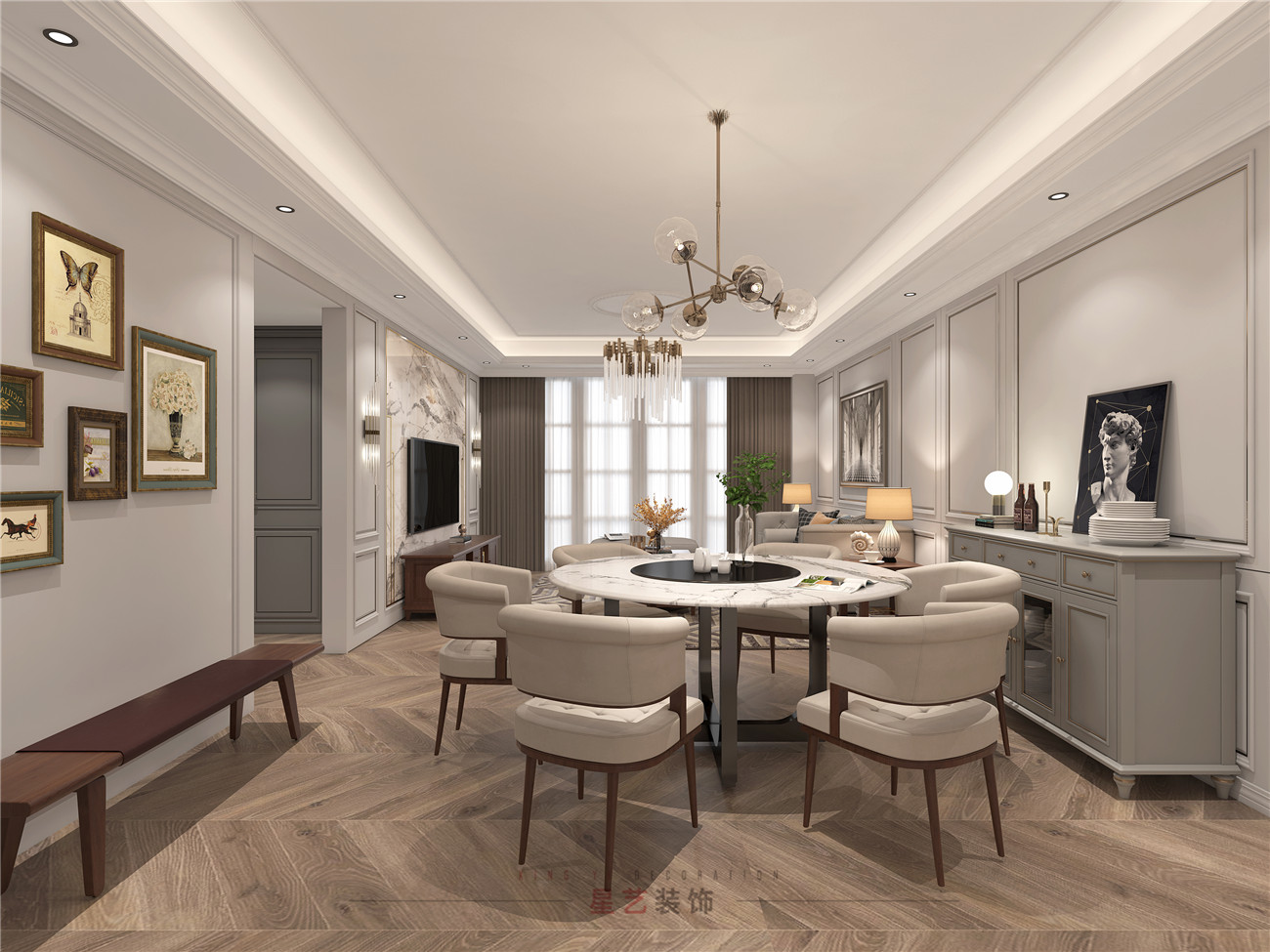 整個用餐區還是比較寬敞的,兩邊的墻面都有用掛畫來裝飾,旁邊就配置了櫥柜部分,好看又實用,整個布局顯得包容又大氣,讓每個家庭成員都可以回家釋放心中的壓力和解放心靈。