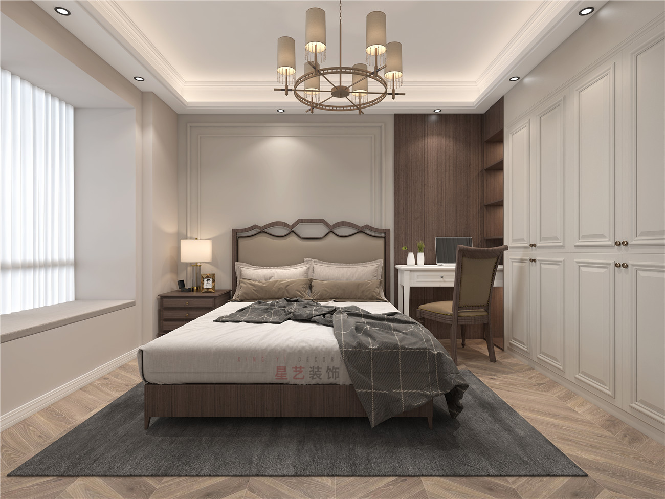 長輩房保留了比較傳統,對稱的設計部分,深色復古的大床在米白色的空間里顯得格外莊重,沒有太多得顏色搭配,主要還是保留了一體的設計風格。